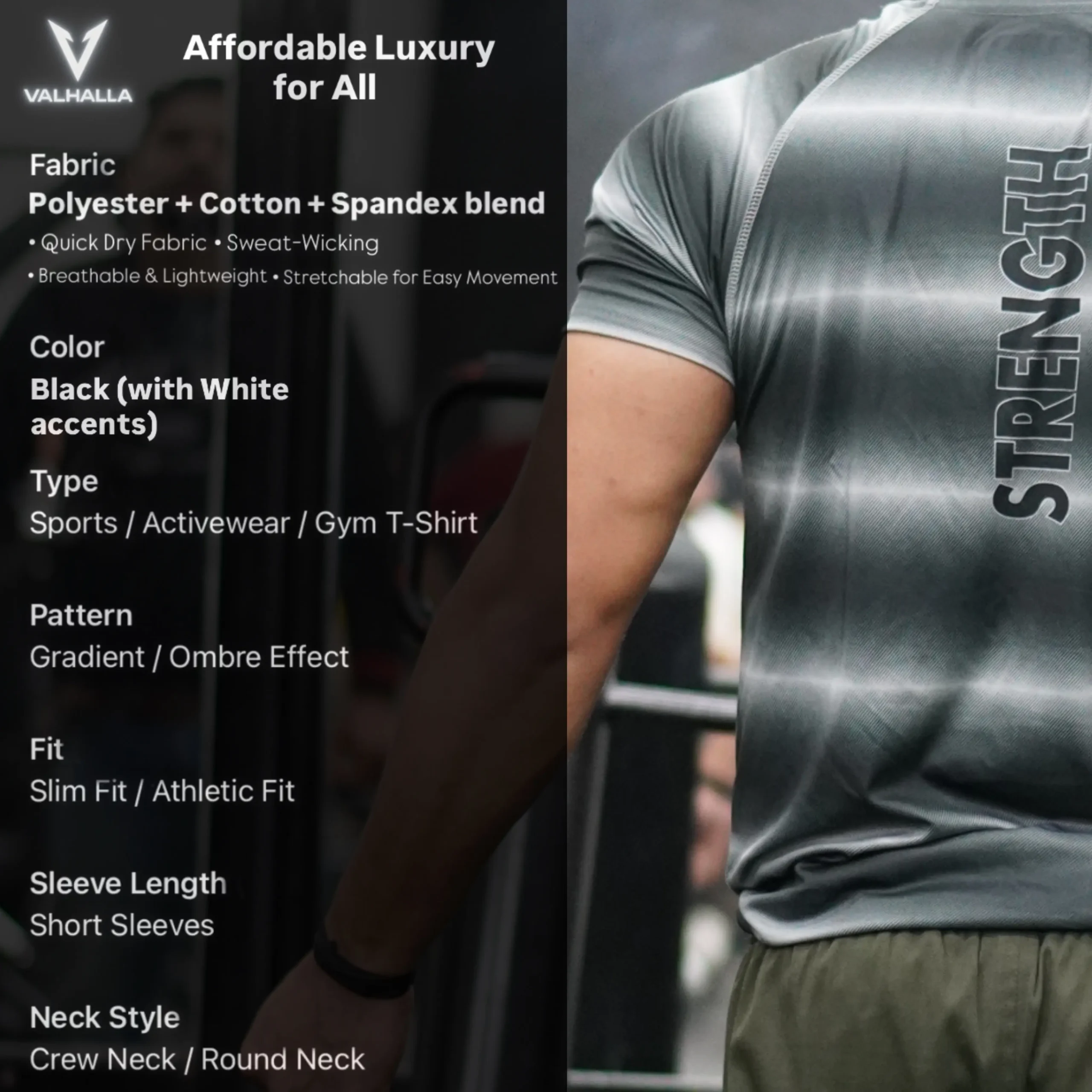 Premium Black Gradient Gym T-Shirt by Valhalla – Quick Dry, Sweat-Wicking, Lightweight & Stretchable. Perfect for Gym, Sports & Daily Activewear.